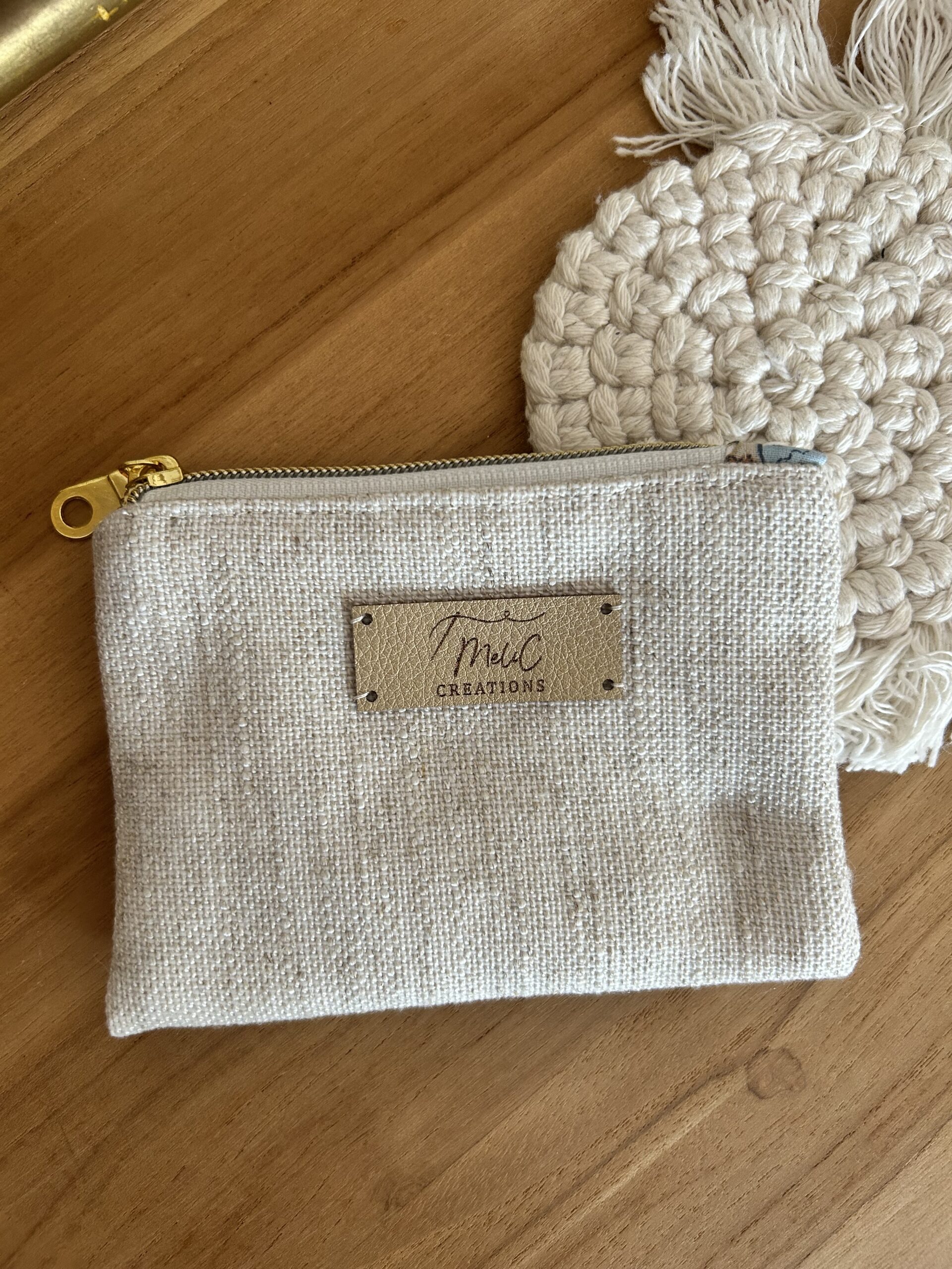 Porte monnaie beige extérieur lin , intérieur fleurs bleus fermeture éclair doré Taille 15*9 cm