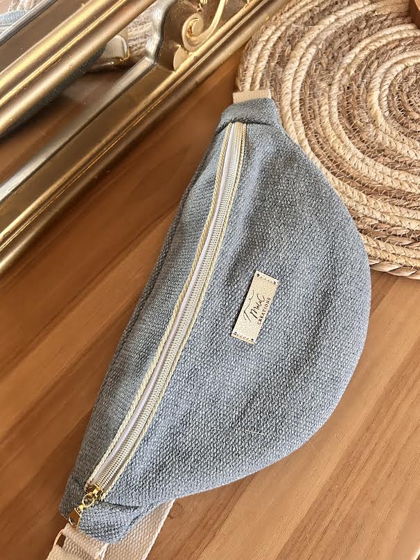 banane taille S bleu texturé coton , effet maille , fermeture bronze si dispo envoi sous 3 jours ouvrés , si en commande 3 semaines de délai.