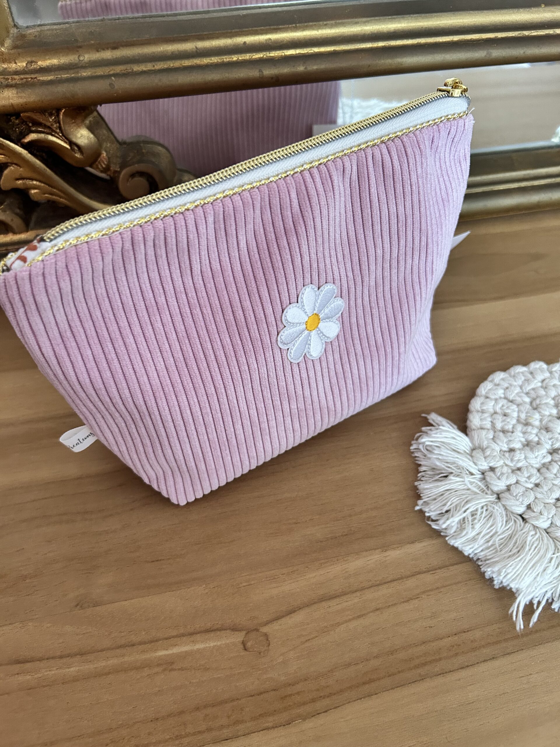 Pochette idéale pour glisser dans son sac ou tout simplement pour y glisser son indispensable maquillage . Celle ci est créée avec un fond qui lui permet un meilleur maintient . dimension 17x22cm rose /marguerite