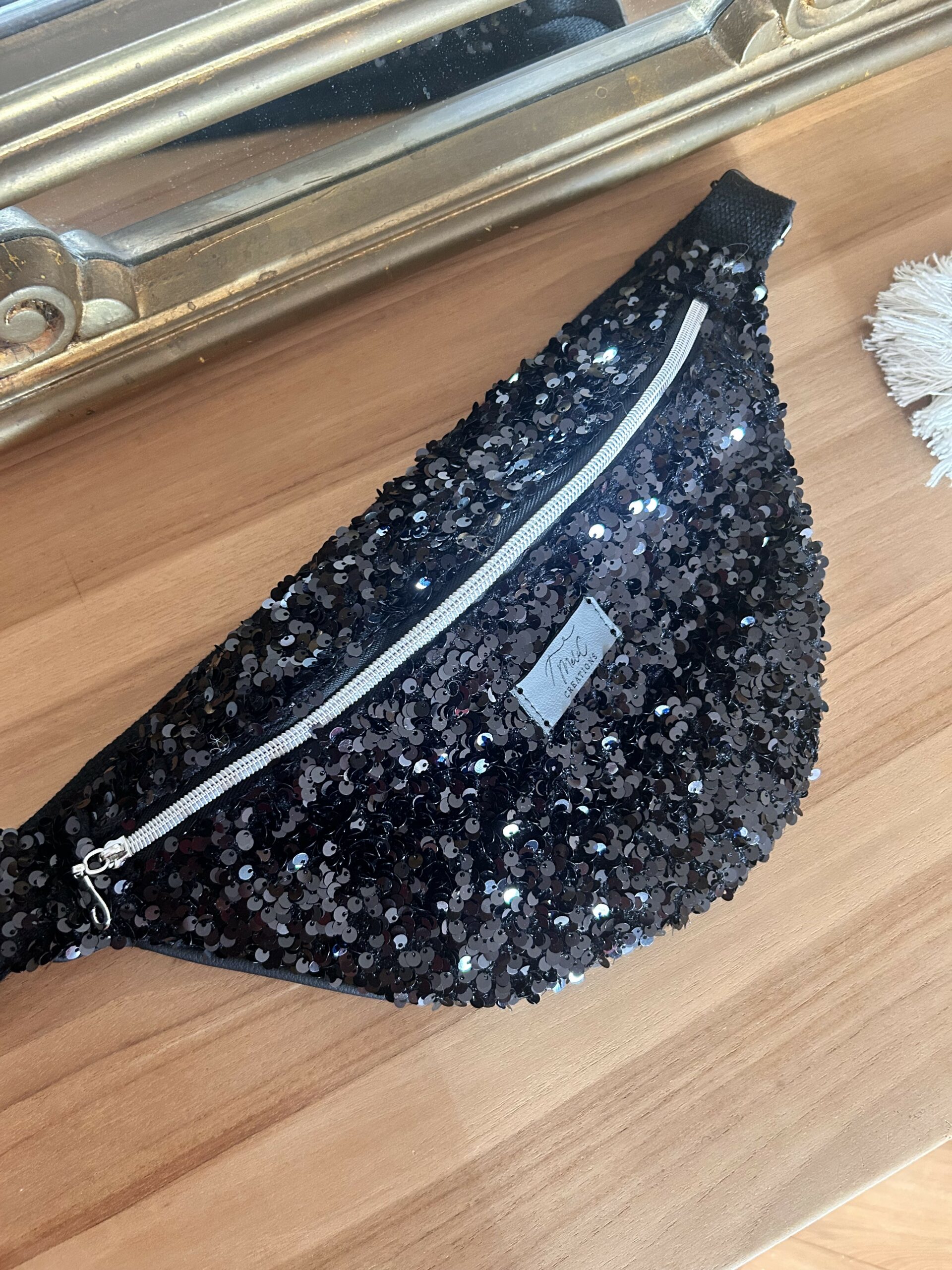 banane taille S sequin noire fermeture éclair argenté , logo MeliC gris si en stock envoi sous 3 jours , si en créations 3-4 semaines de délai